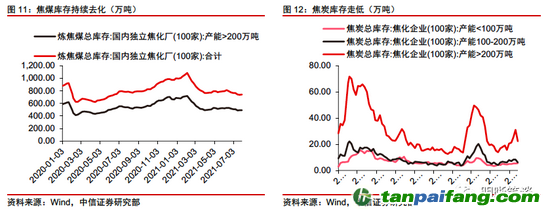 (2)短期補庫意愿強烈為雙焦價格形成支撐,后續(xù)鋼廠和焦企實際限產的執(zhí)行情況是主要關注點。下半年,銷售拐點和監(jiān)管高壓對地產投資的影響預計會使得地產周期向下,但制造業(yè)持續(xù)擴張或帶動有色金屬需求回升,預計基建投資維持穩(wěn)定增長,建材市場需求仍舊可以維持,總體來看需求不弱。供給方面,煤礦安全環(huán)保檢查執(zhí)行嚴格,部分礦區(qū)產能受限,供給偏緊局面短期仍難以緩解。觀察雙焦庫存,焦煤和焦炭總庫存處于今年以來低位,短期補庫意愿偏強為雙焦價格形成支撐,后續(xù)需要關注鋼廠和焦企實際限產的執(zhí)行情況,若鋼鐵產量大幅收縮則雙焦供給端趨緊局面或被扭轉。 本文`內-容-來-自;中_國_碳_交^易=網(wǎng) tan pa i fa ng . c om