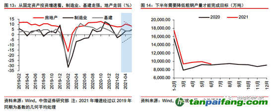 鋼鐵方面,限產目標清晰,限產穩(wěn)步推進下減碳糾偏影響有限,需求端雖然地產投資走弱但基建投資回暖,預計鋼價高位波動運行。去年年底以來,工信部層多次表示堅決壓縮粗鋼產量,確保2021年粗鋼產量同比下降。今年上半年全國粗鋼產量累計達56332.65萬噸,同比增長11.8%。經(jīng)測算,為保證全年鋼產量持平,今年下半年需要較去年下半年產量降低約10.44%才能完成目標。當前我國鋼鐵限產計劃有序合理,糾偏“運動式‘減碳’”對于鋼鐵限產規(guī)劃的影響有限,預計下半年鋼鐵行業(yè)限產將按照計劃穩(wěn)步推進。需求端雖然地產放緩,但基建有望回暖,預計整體不會出現(xiàn)大幅縮減。綜合供需雙端來看,預計下半年鋼價或高位波動運行。
