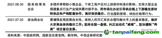 政治局會議首提糾正運動式“減碳”,將有助于“保供穩(wěn)價”工作的推進。5月以來國家相關部門多次提及大宗商品漲價問題,表示需要保障大宗商品供給,遏制價格不合理上漲以及投機行為,防止價格傳導至民生領域。7月的政治局會議再提“做好大宗商品保供穩(wěn)價工作”,并對碳中和相關政策做出指導:“堅持全國一盤棋,糾正運動式‘減碳’,堅決遏制‘兩高’項目盲目發(fā)展”。值得注意的是,雖然國內定價的焦煤、動力煤等大宗商品價格走高的主要原因是供需缺口的存在,但運動式“減碳”或也是觸發(fā)因素之一。以短期運動式“減碳”應對長期的雙碳目標,對于傳統(tǒng)高能耗企業(yè)帶來過大沖擊,既不利于就業(yè)民生、也不利于大宗商品價格穩(wěn)定。 禸*嫆唻@洎:狆國湠棑倣茭昜蛧 τāńpāīfāńɡ.cōm