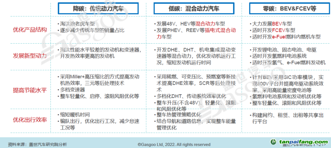 大力發(fā)展低碳和零碳技術(shù),圖片來(lái)源:蓋世汽車(chē)研究院面對(duì)雙碳?jí)毫Γ瑑?yōu)化產(chǎn)品結(jié)構(gòu)、發(fā)現(xiàn)新型動(dòng)力,已經(jīng)成為各大車(chē)企的共識(shí)。前文提到的豐田、大眾和日產(chǎn)為了在2050年實(shí)現(xiàn)碳中和目標(biāo),均提出要加大電氣化車(chē)型的銷(xiāo)量占比,同時(shí)在生產(chǎn)技術(shù)領(lǐng)域制定了應(yīng)對(duì)策略。 本*文`內(nèi)/容/來(lái)/自:中-國(guó)-碳^排-放“交|易^網(wǎng)-tan pai fang . c o m