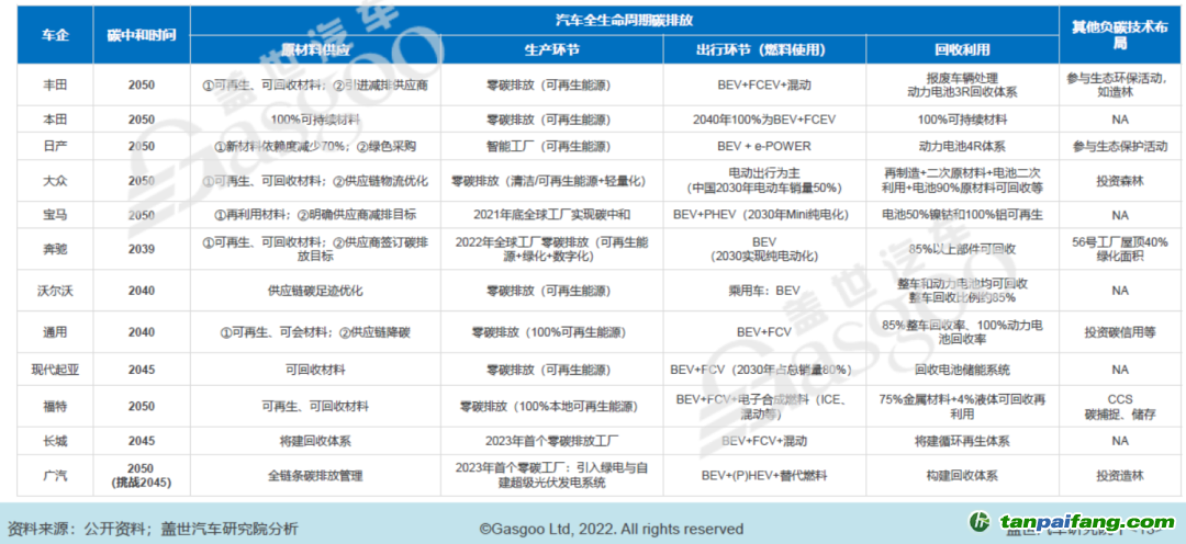部分車(chē)企碳中和時(shí)間表及減碳舉措,圖片來(lái)源:蓋世汽車(chē)研究院為如期實(shí)現(xiàn)汽車(chē)全生命周期碳中和,車(chē)企們需要從原材料供應(yīng)、生產(chǎn)環(huán)節(jié)、出行環(huán)節(jié)、回收利用等方面制定系列措施。比如,豐田為了在2050年實(shí)現(xiàn)碳中和,分別在2025年和2030年設(shè)置了一個(gè)里程碑,其中規(guī)定2025年在全球的電動(dòng)車(chē)銷(xiāo)量超過(guò)550萬(wàn)輛,全球新車(chē)平均二氧化碳排放較2010年較少30%以上;2030年,豐田將推出30款BEV車(chē)型,銷(xiāo)量達(dá)到350萬(wàn)輛,全球新車(chē)平均二氧化碳排放較2010年減少35%。 本文+內(nèi)-容-來(lái)-自;中^國(guó)_碳+排.放_(tái)交^易=網(wǎng) t a n pa ifa ng .c om