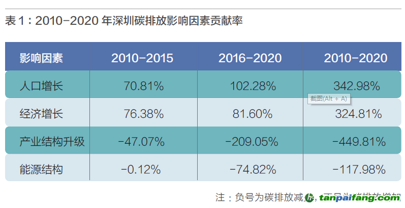 清潔能源和可再生能源,引起碳排放量下降1.2倍,二者合計(jì)大致抵銷了經(jīng)濟(jì)增長(zhǎng)與人口增加引起的碳排放量的增長(zhǎng)。對(duì)比2010-2015年和2016-2020年兩個(gè)時(shí)期,深圳人口規(guī)模超過1300萬后凈增超400萬人,經(jīng)濟(jì)規(guī)模超過2萬億元,對(duì)碳排放的拉動(dòng)明顯提高;產(chǎn)業(yè)結(jié)構(gòu)升級(jí)和能源結(jié)構(gòu)調(diào)整發(fā)揮了更大作用,抵銷了人口和經(jīng)濟(jì)增長(zhǎng)影響(見表1)。
