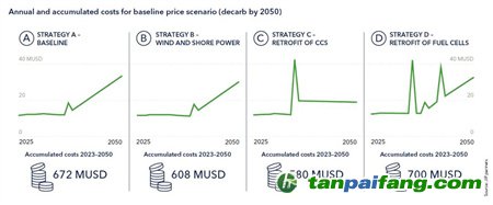 JIP 應用 DNV FuelPath模型來評估設計方案的經濟性能,即特定船舶可用的燃料和能源效率策略?;诓煌募僭O和情景,該模型可幫助船東確定能夠適應未來變化并在船舶生命周期內各種情景下都能表現良好的設計方案??冃б钥倱碛谐杀竞推渌洕鷧祦肀硎?。由于未來的燃料價格難以預測,因此該研究考慮了三種不同的燃料價格情景(高、基線、低)。 本文+內-容-來-自;中^國_碳+排.放_交^易=網 t a n pa ifa ng .c om