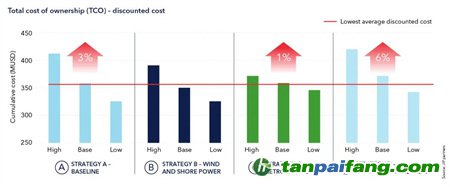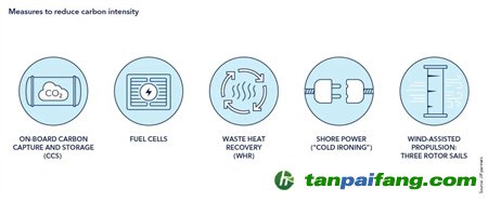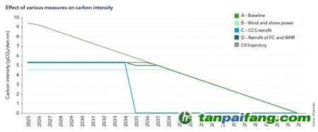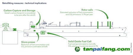 船舶在港時使用岸電將進一步減少燃料消耗,并將二氧化碳排放量減少約8-9%(相對于年總排放量),前提是停靠港口擁有所需的基礎設施。船上碳捕獲和儲存 (CCS) 需要對船上進行重大改造,例如額外的甲板以容納系統(tǒng)和二氧化碳氣罐。為系統(tǒng)供電所需的額外燃料(約 24%)不會影響船舶的碳足跡,改裝后碳足跡被認為是零。 本*文@內-容-來-自;中_國_碳^排-放*交-易^網 t an pa i fa ng . c om