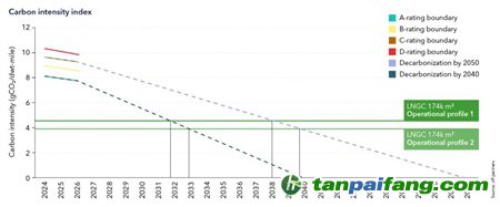 圖表中船舶的碳強度(顯示為任一運營模式的水平線)與2050 年和 2040 年的脫碳軌跡相交的點,顯示了改造節(jié)能措施和碳減排技術和/或開始使用碳中和燃料混合的最晚時間,使船舶能夠繼續(xù)遵守排放限制。