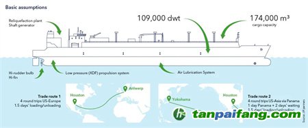 該原型船是一艘 109, 000dwt的LNG運輸船,能裝載174, 000立方米LNG,配備低壓(XDF)推進系統(tǒng)和再液化裝置。