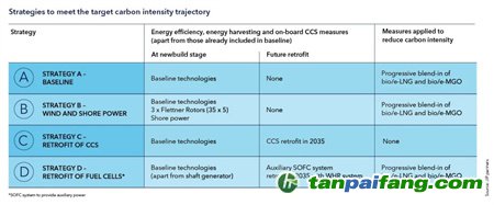 策略 D:2035 年安裝模塊化燃料電池系統(tǒng)和余熱回收系統(tǒng)。到 2037 年,bio/e-LNG 和 bio/e-MGO 逐步加入,以實現目標碳強度。 本+文`內.容.來.自:中`國`碳`排*放*交*易^網 t a np ai fan g.com