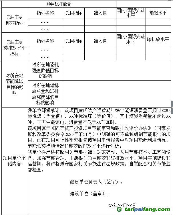 第二十條 固定資產(chǎn)投資項(xiàng)目節(jié)能審查應(yīng)納入甘肅省投資項(xiàng)目在線審批監(jiān)管平臺(tái)統(tǒng)一管理,實(shí)行網(wǎng)上受理、辦理、監(jiān)管和服務(wù),實(shí)現(xiàn)審查過程和結(jié)果的可查詢、可監(jiān)督。不單獨(dú)進(jìn)行節(jié)能審查的固定資產(chǎn)投資項(xiàng)目應(yīng)當(dāng)通過在線審批監(jiān)管平臺(tái)報(bào)送項(xiàng)目能源消費(fèi)和碳排放情況摘要表(見附件1)。 本文+內(nèi)-容-來-自;中^國(guó)_碳+排.放_(tái)交^易=網(wǎng) t a n pa ifa ng .c om