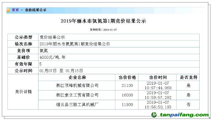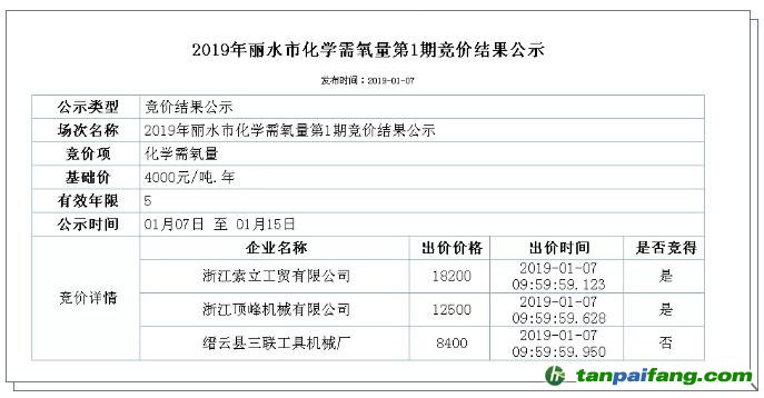 本次競(jìng)價(jià)化學(xué)需氧量和氨氮,交易底價(jià)均為4000元/噸•年,出讓期限為5年。交易采用全省統(tǒng)一的“浙江省排污權(quán)競(jìng)價(jià)網(wǎng)”為電子競(jìng)價(jià)