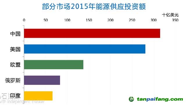 2015年中國能源消耗達(dá)到歷史新高,受其影響中國重返全球第一大能源投資市場(chǎng)。同時(shí)由于油氣投資活動(dòng)減弱,2014年排在首位的美國投資額僅為2800億美元,比上年減少750億美元。下圖為2015年全球部分市場(chǎng)的能源供應(yīng)投資額。 本+文內(nèi).容.來.自:中`國`碳`排*放*交*易^網(wǎng) ta np ai fan g.com