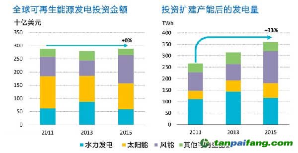 2011年以來全球在可再生能源發(fā)電投資基本平穩(wěn),但是由于可再生能源成本的下降,每年新增的可再生能源發(fā)電量逐年增加,2015年超出2011年33%??稍偕茉窗l(fā)電量可滿足2015年全球增長的電力需求量。風(fēng)能發(fā)電勢(shì)頭最猛,在2015年增長了35%,海上風(fēng)力發(fā)電的增長創(chuàng)下以往記錄。