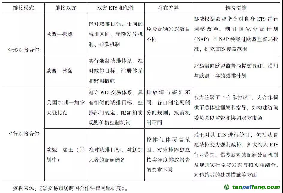 (1)碳交易市場(chǎng)鏈接的前提是兩個(gè)市場(chǎng)具備較大的共通性和兼容性。傘形模式下,挪威、冰島和列支敦士登均調(diào)整自身的ETS體系以增強(qiáng)和歐盟ETS的相似性;平行模式下,加州與魁北克均遵守WCI交易體系框架,而瑞士則通過調(diào)整自身的交易制度以強(qiáng)化與歐盟的一致性。 本*文@內(nèi)-容-來-自;中_國(guó)_碳^排-放*交-易^網(wǎng) t an pa i fa ng . c om