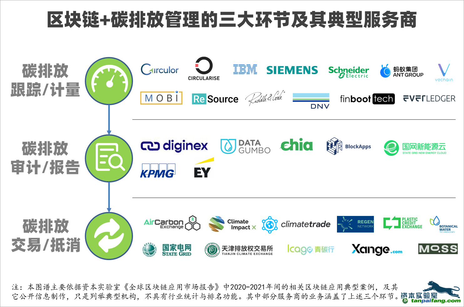 2020-2021年間,全球碳排放管理領域的區(qū)塊鏈應用已經(jīng)從碳排放跟蹤/計量快速延伸到碳排放審計/報告,再到碳排放交易/抵消環(huán)節(jié)的全鏈條,實現(xiàn)了井噴式發(fā)展,并在行業(yè)覆蓋程度、參與主體類型、產(chǎn)品與模式創(chuàng)新等方面呈現(xiàn)出快速而巨大的躍升。