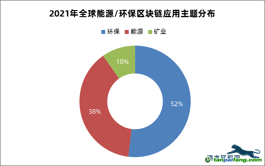 據(jù)資本實驗室不完全統(tǒng)計,2021年全球能源/環(huán)保區(qū)塊鏈應用案例數(shù)量達到154起,占區(qū)塊鏈應用案例總數(shù)的12%,是除了金融行業(yè)外,應用活躍度最高的行業(yè)。其中,環(huán)保主題應用占比最高,達到52%;其次是能源主題(38%)與礦業(yè)主題(10%)。
