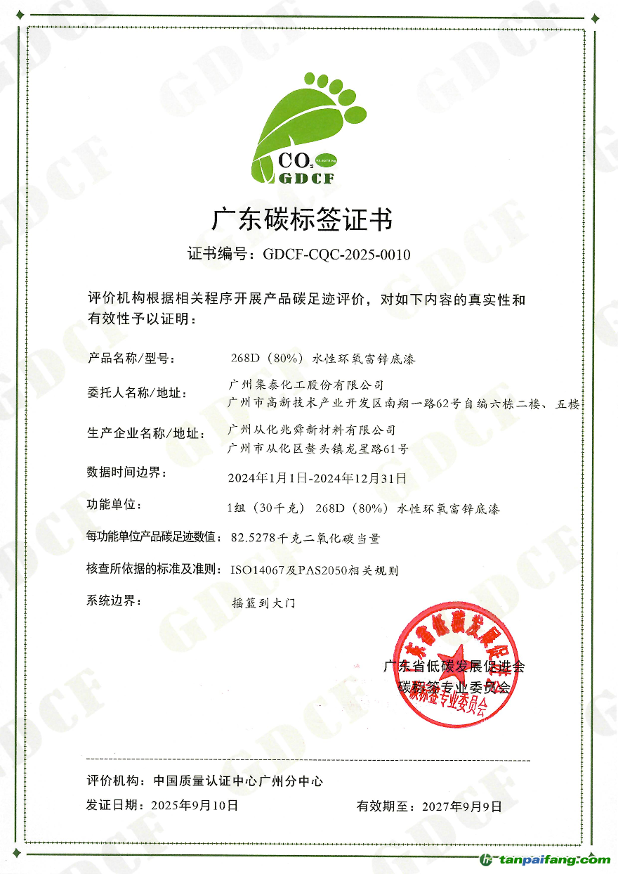 市生態(tài)環(huán)境局從化分局積極響應(yīng)推廣廣東碳標(biāo)簽應(yīng)用場景,指導(dǎo)廣州集泰化工股份有限公司的“268D(80%)水性環(huán)氧富鋅底漆”產(chǎn)品開展了全生命周期碳足跡核算。經(jīng)核定,該產(chǎn)品每功能單位的碳足跡為82.5278千克二氧化碳當(dāng)量,經(jīng)評價機(jī)構(gòu)依據(jù)相關(guān)程序開展產(chǎn)品碳足跡評價,該產(chǎn)品成功取得碳標(biāo)簽證書。此前從化分局陸續(xù)指導(dǎo)了從化區(qū)獲得首張荔枝產(chǎn)品碳標(biāo)簽證書;指導(dǎo)萬力輪胎股份有限公司成為國內(nèi)輪胎行業(yè)中首家獲得