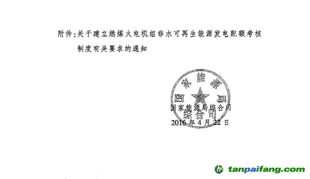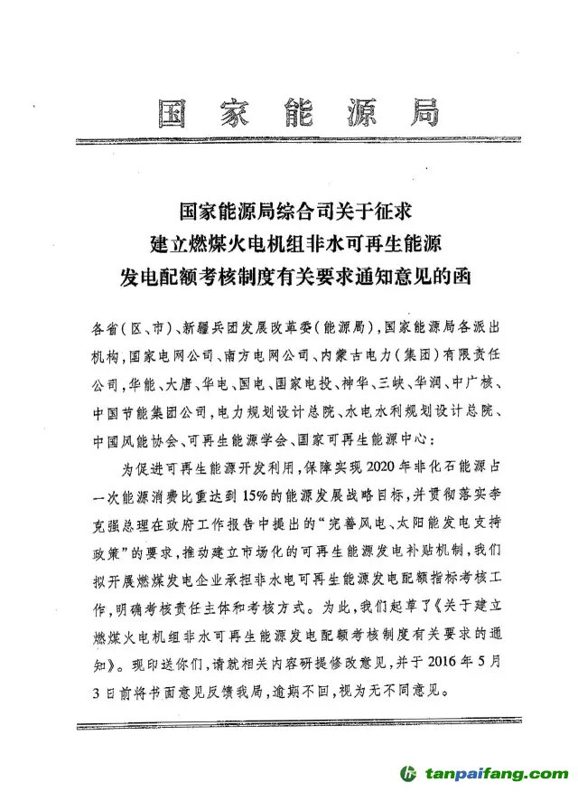 2016年4月22日,國家能源局官發(fā)布重要通知,《國家能源局綜合司關于征求建立燃煤火電機組非水可再生能源發(fā)電配額考核制度有關要求通知意見的函》,文件要求對于未完成非水可再生能源配額要求的燃煤發(fā)電企業(yè)取消其發(fā)電業(yè)務許可證! 禸*嫆唻@洎:狆國湠棑倣茭昜蛧 τāńpāīfāńɡ.cōm