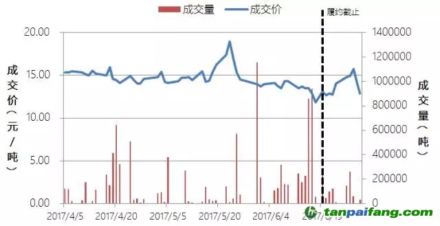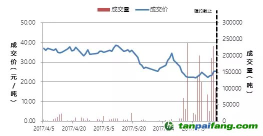 深圳共有8家企業(yè)未按時履約,大多數(shù)為電子電器制造類企業(yè)。在6月之前,除了5月中旬的幾筆大額交易,深圳的交易量較低。進(jìn)入6月以后,成交量呈現(xiàn)明顯的上升趨勢,并一直持續(xù)到履約截止日期以前。價格維持在30元/噸左右,變動不大。