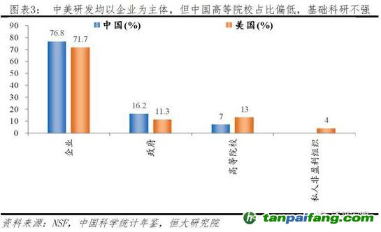 2、改革科技管理體制,賦予研究人員更大的自由度,預(yù)算管理上放寬薪酬發(fā)放的限制,國外經(jīng)驗表明人員費是基礎(chǔ)科學(xué)研究經(jīng)費支出的主要部分,賦予科研人員科研產(chǎn)權(quán)以激發(fā)積極性。強化多來源的成果評價機制,區(qū)分基礎(chǔ)科學(xué)研究與應(yīng)用基礎(chǔ)科學(xué)研究的評價體系?;A(chǔ)科學(xué)成果由學(xué)術(shù)共同體評價,聘請國際科研人員,主要考核其對學(xué)科發(fā)展的意義;應(yīng)用基礎(chǔ)研究成果由第三方應(yīng)用部門根據(jù)實際應(yīng)用情況評價。加強基礎(chǔ)研發(fā),降低政府機構(gòu)研發(fā)的比重,提高高等院校研發(fā)經(jīng)費的比重。改革教育管理制度,夯實基礎(chǔ)教育,提高高等教育投入,放開教育行業(yè)管制,改革教育理念,充分給予學(xué)術(shù)討論的自由,生產(chǎn)思想與人才。與美國比,我國學(xué)前教育較好,但高等教育嚴(yán)重滯后。