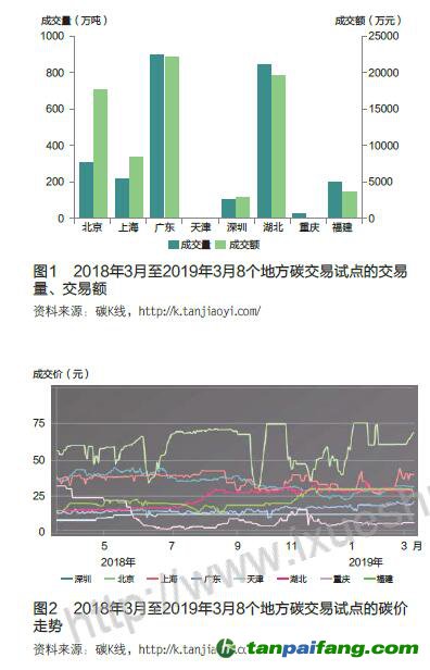 由表1可見,試點地區(qū)之間的規(guī)則有的相似,有的差別很大,這都是充分考慮到本地情況的結果。規(guī)則和地區(qū)發(fā)展各異,市場表現(xiàn)必然不同。圖1和圖2是2018年3月至2019年3月各試點的交易量、交易額和
