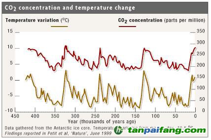 二氧化碳和氣溫的變化曲線本來是兩條非常接近的曲線,但人們在制作曲線圖的時(shí)候習(xí)慣性地將它們擺放在一前一后兩個(gè)位置。二氧化碳變化曲線在前,全球氣溫變化曲線在后,看上去就像是二氧化碳變化導(dǎo)致了全球氣溫變化一樣。