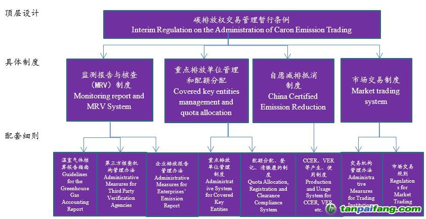 2) 具體制度規(guī)范,主要解決碳市場(chǎng)正常運(yùn)行的相關(guān)問題,包括監(jiān)測(cè)報(bào)告與核查(MRV)制度、重點(diǎn)排放單位管理和配額分配、抵消制度、市場(chǎng)交易制度等。