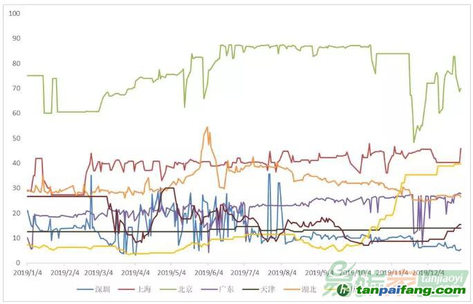 2019年北京碳市場(chǎng)的碳價(jià)遠(yuǎn)高于其他試點(diǎn)碳市場(chǎng),日均成交價(jià)上達(dá)87.48元/噸,下探到48.40元/噸,日均成交最低價(jià)仍高于其余市場(chǎng)的日均成交最高價(jià)。重慶市場(chǎng)的碳價(jià)為八試點(diǎn)中最低,前三季度在10元/噸以下波動(dòng),最低達(dá)到3.38元/噸,但從第四季度開(kāi)始經(jīng)歷了一波短期上漲,在年末達(dá)到峰值39.7元/噸。深圳碳市場(chǎng)價(jià)格波動(dòng)劇烈且較頻繁,最低達(dá)到3.3元/噸,最高達(dá)到35.64元/噸。其余試點(diǎn)碳市場(chǎng)除個(gè)別極值影響外,價(jià)格均較為平穩(wěn)波動(dòng)。