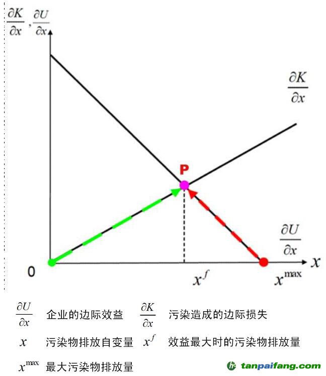 綠色虛線下方的面積表示當(dāng)產(chǎn)權(quán)歸給居民時,鋼鐵廠需要付給居民的賠償費,這筆錢比鋼鐵廠的利潤要少,此時鋼鐵廠樂于付出賠償費,來保證自己的產(chǎn)量。到達p點時,鋼鐵廠繼續(xù)排放更多污染物所帶來的收益不及自己要付給居民的賠償費,鋼鐵廠自然而然地不會繼續(xù)排放污染物,這是常規(guī)的污染方來負責(zé)的原則。紅色虛線下方的面積表示當(dāng)產(chǎn)權(quán)歸給鋼鐵廠時,居民為了不造成太嚴重的健康損失,而付給鋼鐵廠的錢,以此來代替鋼鐵廠的利潤,從而說服鋼鐵廠不再排放更多的污染物。這筆錢比健康損失成本要少,居民也愿意付出。但當(dāng)居民付出的錢到達p點時,會發(fā)現(xiàn)繼續(xù)付給鋼鐵廠更多的錢比自己付出些健康成本要高,這時就不劃算了,因此居民也不會再支付更多錢來讓鋼鐵廠減排。因此無論產(chǎn)權(quán)歸誰,經(jīng)過雙方談判協(xié)商后達成交易的鋼產(chǎn)量和污染排放量都會平衡在p點。