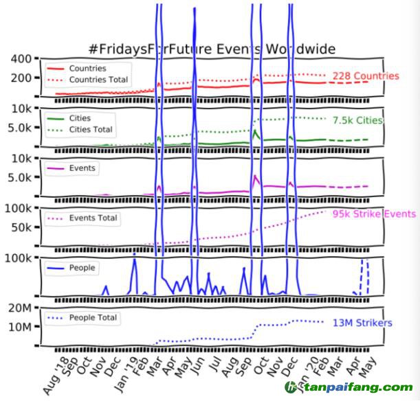 碳排放。15歲的格蕾塔立即通過媒體報道及互聯(lián)網(wǎng)的傳播,獲得了國際性的廣泛關(guān)注。她發(fā)起“星期五為了未來”(#Fridays for Future)的反氣候變化運動,吸引了一大批在校年輕人參與。據(jù)“星期五為了未來”活動官網(wǎng)數(shù)據(jù)顯示,目前已有228個國家和地區(qū)參與這項抗議行動,共組織活動95000場,共有1300萬抗議者加入。