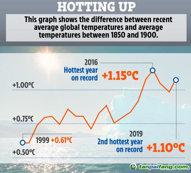 世界氣象組織(WMO)的一份報(bào)告證實(shí),2019年全球平均溫度比工業(yè)化前的水平高1.1°C。這意味著,地球距離195個(gè)國(guó)家在2015年《巴黎氣候協(xié)定》(Paris climate agreement)中商定的2攝氏度上限已經(jīng)有50%以上的距離。