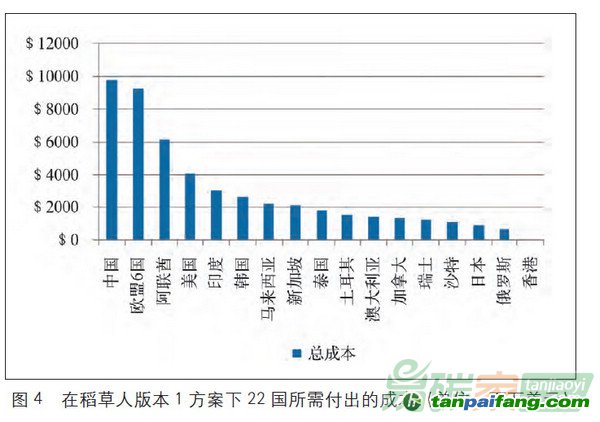 ?。?)各國購買碳抵消量所需成本根據(jù)各國預(yù)測的碳排放量和未來的碳價(jià)格,為實(shí)現(xiàn)2020年碳中性增長目標(biāo),主要22個(gè)國家進(jìn)行碳抵消需要的成本。以中速增長的情景為例,中國付出的成本遠(yuǎn)遠(yuǎn)高于其他國家,發(fā)展中國家所要付出的減排成本高于發(fā)達(dá)國家。