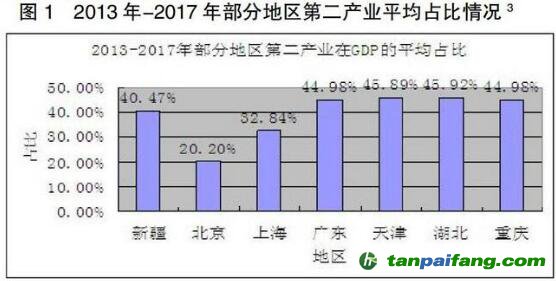 碳交易市場的建立,有利于優(yōu)化經(jīng)濟結(jié)構(gòu),提高發(fā)展質(zhì)量。新疆第二產(chǎn)業(yè)在GDP中占比較高。如圖1所示,2013-2017年全國第二產(chǎn)業(yè)在GDP中的占比平均值為41.68%,而新疆近20年來(1999-2017)的平均值為41.78%,峰值為2008年的49.6%,五年來的平均值為40.47%2。新疆與其他七個開展碳交易市場的省市相比,呈現(xiàn)出第二產(chǎn)業(yè)在GDP中占比較高的特點。由此可見,新疆經(jīng)濟發(fā)展具有高度依賴第二產(chǎn)業(yè)的特點,以消耗化石能源為動力的第二產(chǎn)業(yè)是經(jīng)濟不斷增長的重要支柱,環(huán)境承載壓力大,優(yōu)化經(jīng)濟結(jié)構(gòu)尤為迫切。