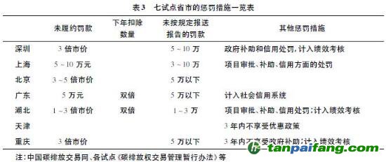 2013—2016 年,除上海以外,其他試點(diǎn)均存在著不履約的個(gè)體,特別是深圳,連續(xù)4 年均未達(dá)到100% 履約。在100% 履約的試點(diǎn)中,推遲履約的現(xiàn)象屢見不鮮。2014 年度的履約期,湖北推遲了近兩個(gè)月才全部完成履約。2015 年度的履約期,湖北和重慶再度推遲履約。2016 年度和2017 年度,部分試點(diǎn)地區(qū)出現(xiàn)了不同程度的推遲履約現(xiàn)象。誠(chéng)信意識(shí)缺乏,相關(guān)法規(guī)約束力不夠,是造成不履約和推遲履約的重要原因。各試點(diǎn)對(duì)未按時(shí)履約企業(yè)的懲罰力度有很大差異,如表3 所示。
