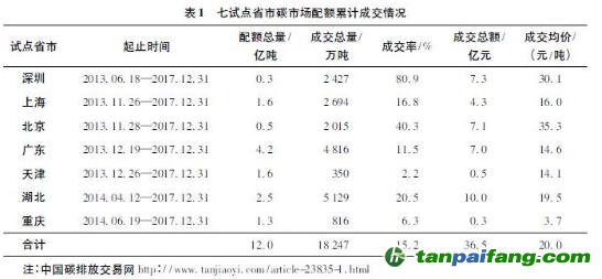 碳排放交易網(wǎng)有關(guān)資料顯示,截至2017 年12 月31 日,全國(guó)配額累計(jì)成交4. 7 億噸,總成交額達(dá)到104. 94 億元。七個(gè)碳交易試點(diǎn)區(qū)域配額累計(jì)交易量為1. 82 億噸,累計(jì)交易額超過(guò)36 億元。各試點(diǎn)省市配額總量、成交量、成交額和成交均價(jià)情況如表1 所示。
