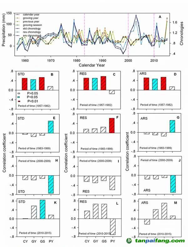 圖2.(A)胡楊樹輪年表對降水的響應;(B-M)樹輪指數(shù)與降水的相關(guān)系數(shù)(CY-自然年;GY-生長年;GS-生長季;PY-前一生長年)