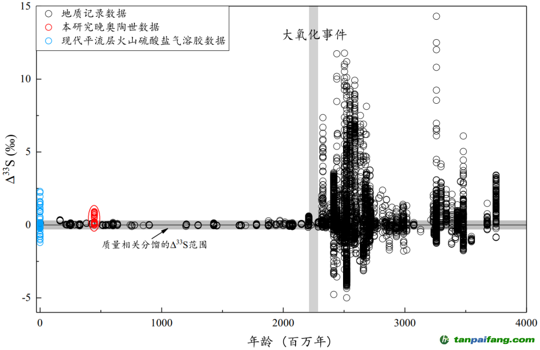 針對(duì)這一科學(xué)問(wèn)題,沈延安課題組開(kāi)辟了新的研究思路,他們對(duì)華南奧陶紀(jì)末生命滅絕地層中的黃鐵礦進(jìn)行了高精度同位素分析,發(fā)現(xiàn)伴隨著晚奧陶火山的噴發(fā),硫同位素出現(xiàn)非質(zhì)量分餾,當(dāng)火山活動(dòng)減弱和停滯后,硫同位素又呈現(xiàn)質(zhì)量分餾。奧陶紀(jì)末非質(zhì)量硫同位素記錄的發(fā)現(xiàn)是23億年以來(lái)地質(zhì)記錄中的首次報(bào)道(下圖)。因此他們提出奧陶紀(jì)末火山活動(dòng)為“平流層火山噴發(fā)”并觸發(fā)和驅(qū)動(dòng)了當(dāng)時(shí)的生命滅絕事件。