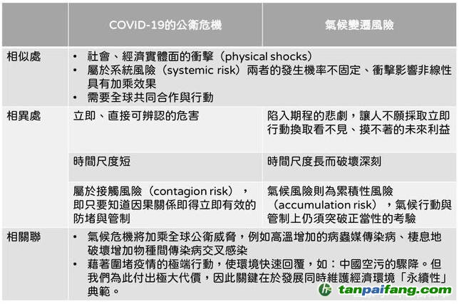 (2)發(fā)生肇因與應(yīng)對措施面向上,二者所處理的時(shí)間尺度上也有所不同,公衛(wèi)危機(jī)相對氣候危機(jī)而言時(shí)間因素來得短許多,因此,相對的,氣候危機(jī)的破壞性將更深刻。