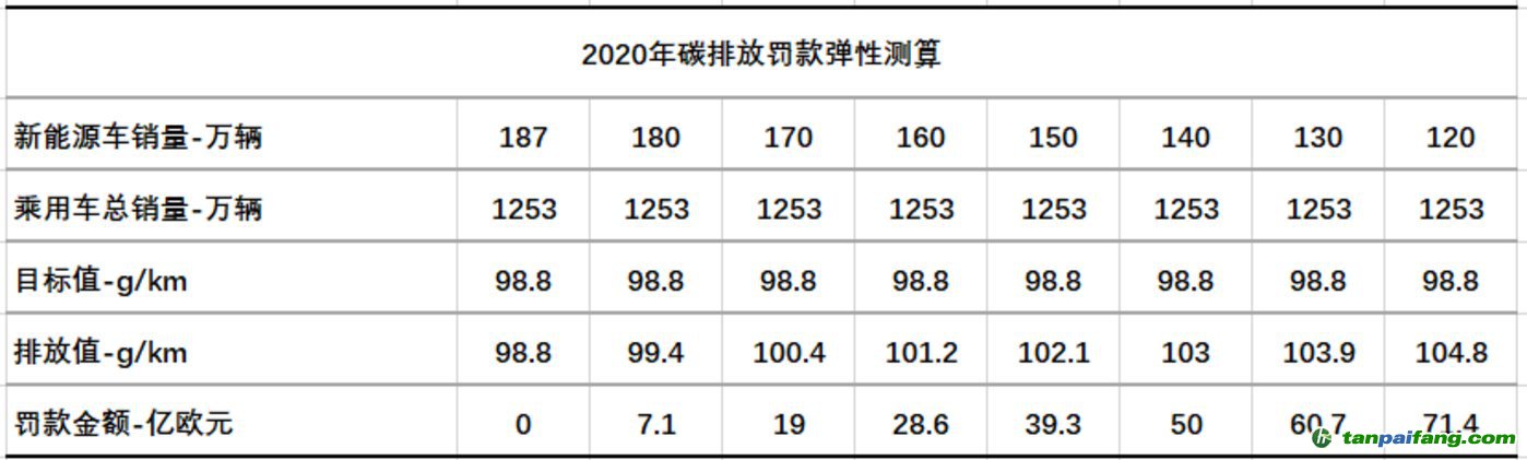 3、如果2020年新能源車達(dá)到187萬的銷量,則不需要交付罰金,每少10萬輛的銷量,大約對應(yīng)10億歐元的罰金,如銷量為120萬輛,則大概需要支付約71.4億歐元罰金,每輛新能源車隱含的碳排放的價(jià)值為1萬歐元,數(shù)字相當(dāng)?shù)捏@人。 內(nèi).容.來.自:中`國*碳-排*放*交*易^網(wǎng) t a npai fa ng.com