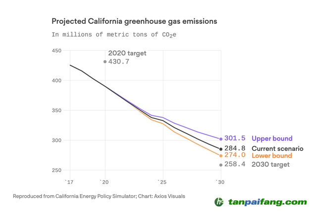 2017年,加州政府頒布州法AB 398,提出了美國最激進的減排目標;計劃到2030年將溫室氣體排放量在1990年水平上減少40%,到2050年實現(xiàn)溫室氣體比1990年減少80%。這意味著加州2030年二氧化碳排放量將從2017年的4.24億噸急劇減少到2.58億噸。 禸*嫆唻@洎:狆國湠棑倣茭昜蛧 τāńpāīfāńɡ.cōm
