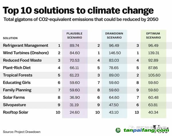 美國(guó)環(huán)境主義者、作家兼企業(yè)家Paul Hawken經(jīng)過(guò)認(rèn)真分析研究,得出結(jié)論以下10種方式減排方式最有效(到2050年的“可能”減排量),有些真的是沒(méi)想到—— 禸*嫆唻@洎:狆國(guó)湠棑倣茭昜蛧 τāńpāīfāńɡ.cōm