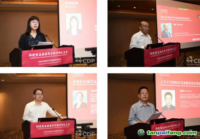以上圖片按順時針方向分別為:北京市地方金融監(jiān)督管理局副局長王穎歡迎致辭、生態(tài)環(huán)境部應(yīng)對氣候變化司副司長孫楨發(fā)表主題演講、清華大學(xué)金融與發(fā)展研究中心主任馬駿發(fā)表主題演講、證監(jiān)會中證金融研究院副院長馬險峰發(fā)表主題演講