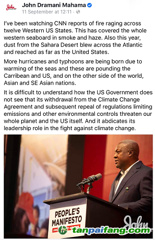 加納網(wǎng)9月13日報道,加納前總統(tǒng)馬哈馬在社交媒體上發(fā)文批判美國政府退出應(yīng)對全球氣候變化的《巴黎協(xié)定》對“整個地球和美國本身”構(gòu)成威脅。 本@文$內(nèi).容.來.自:中`國`碳`排*放^交*易^網(wǎng) t a np ai fan g.c om