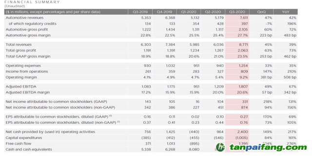 據(jù)報(bào)道,特斯拉三季度的收入增長了39%,達(dá)到88億美元。汽車收入猛增42%,至76億美元,第三季度汽車業(yè)務(wù)毛利率為27.7%,高于二季度,連續(xù)第三個(gè)季度超過25%。
