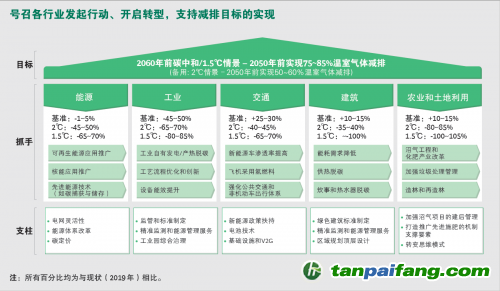 在碳中和目標(biāo)的指引下,能源、交通、工業(yè)、建筑、農(nóng)業(yè)與土地利用五大部門需要共同努力,開啟低碳轉(zhuǎn)型(參閱下圖)。為了實(shí)現(xiàn)1.5℃路徑下溫室氣體減排目標(biāo),五大部門需要達(dá)成約60%-105%不等的減排幅度,對于部分部門來說,接近零排放級別。這意味著以果決的政策驅(qū)動、機(jī)制改革為根基,以積極有力的減排舉措為抓手,推動行業(yè)的根本變革、企業(yè)的綠色轉(zhuǎn)型與公眾的減碳理念。比如,在能源部門中積極推進(jìn)能源體制改革,促進(jìn)公平競爭與技術(shù)創(chuàng)新。在工業(yè)部門中挖掘工藝流程創(chuàng)新的減碳潛力,并引導(dǎo)企業(yè)建立完善的節(jié)能減排監(jiān)管能力。在交通、建筑部門,提升社會對交通工具電動化、炊事與熱水電氣化的接受程度。