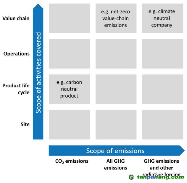 下圖顯示不同的氣候承諾,橫軸顯示了一個組織排放的潛在范圍,從二氧化碳到氣候中性??v軸顯示所涵蓋的活動范圍,從本地到組織的整個價值鏈。