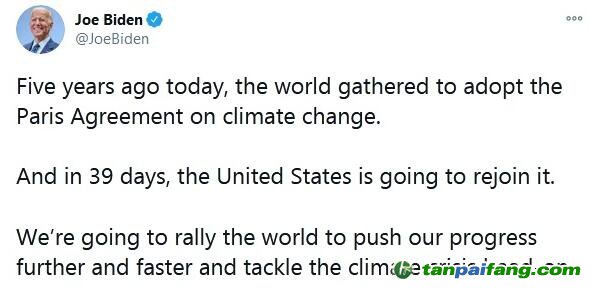 拜登寫到:“五年前的今天,世界各國齊聚一堂,通過了關(guān)于氣候變化的《巴黎協(xié)定》。