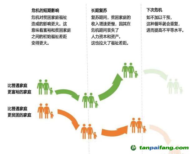 從歷次災(zāi)害中獲得的證據(jù)顯示,最貧困家庭的福祉所受影響不僅更大,其災(zāi)后復(fù)蘇進(jìn)程也更慢(參見圖1)。我們發(fā)現(xiàn),當(dāng)前有三大原因使得我們對(duì)這一格局表示關(guān)切。這些原因如得不到解決,這一格局也將在此次疫情危機(jī)中顯現(xiàn)。
