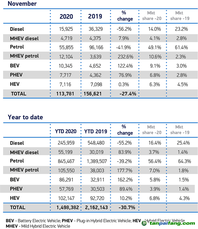 英國2020年11月汽車市場銷量統(tǒng)計(單位:輛)