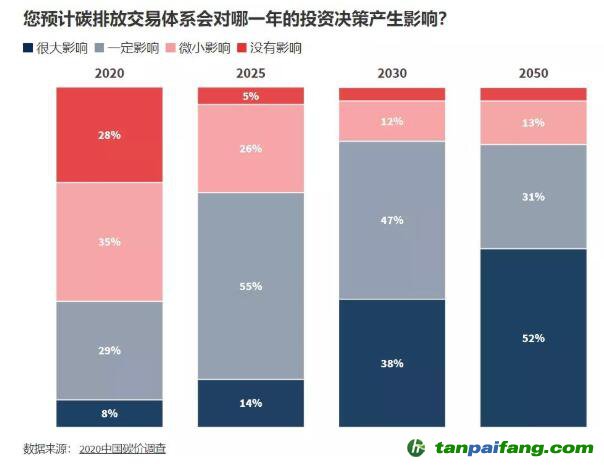 受訪者預(yù)計(jì),未來(lái)幾年內(nèi)碳排放權(quán)交易體系將對(duì)投資決策產(chǎn)生越來(lái)越大的影響。超過三分之一的受訪者表示今年(2020年)的投資決策將受到很大或中等程度的影響(值得注意的是許多受訪者代表的企業(yè)是八個(gè)地方碳交易試點(diǎn)的參與者)。當(dāng)被問及對(duì)于2025年投資決策的影響時(shí),這一比例上升到了69%。預(yù)期到2025年投資決策不會(huì)受到影響的受訪者比例僅為5%。