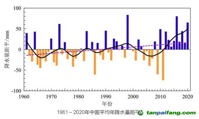 1961~2020年中國平均年降水量變化情況。 資料來源:《中國氣候變化藍皮書(2021)》
