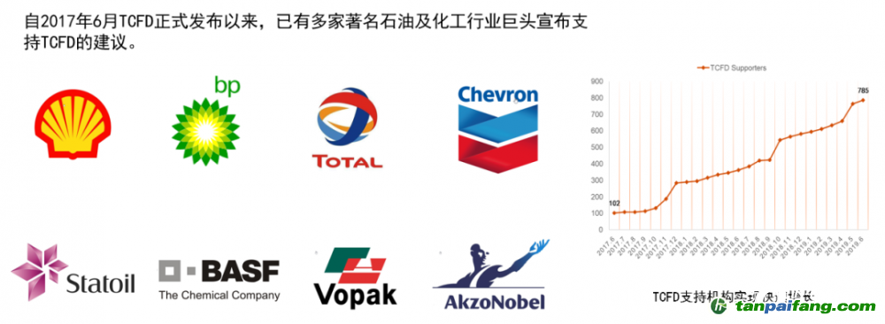 TCFD的核心價(jià)值在于幫助采用該套體系的機(jī)構(gòu)審視氣候變化可能帶給他們的風(fēng)險(xiǎn)和機(jī)遇,而非僅是滿足于合規(guī)運(yùn)營或信息披露。它對(duì)氣候風(fēng)險(xiǎn)和機(jī)遇進(jìn)行了歸類并將最終與機(jī)構(gòu)的財(cái)務(wù)信息相連接。這對(duì)于投資機(jī)構(gòu)分析投資組合預(yù)測其收益具有重要的意義。旨在通過制定統(tǒng)一的氣候變化相關(guān)信息披露框架,來促進(jìn)信息公開透明,使企業(yè)能夠了解金融系統(tǒng)對(duì)于氣候變化的敞口風(fēng)險(xiǎn);同時(shí),該風(fēng)險(xiǎn)控制機(jī)制將氣候變化的指標(biāo)直接應(yīng)用在企業(yè)的損益表和資產(chǎn)負(fù)債表等財(cái)務(wù)信息里,對(duì)企業(yè)的碳資產(chǎn)進(jìn)行動(dòng)態(tài)展現(xiàn),因此這個(gè)機(jī)制既可以作為企業(yè)自身的風(fēng)險(xiǎn)防控內(nèi)控機(jī)制,亦可把它理解成是投資企業(yè)的風(fēng)險(xiǎn)防控的指南。目前國際上眾多能源企業(yè),特別是油氣企業(yè)都已經(jīng)紛紛加入(見圖3)。 本*文`內(nèi)/容/來/自:中-國-碳^排-放“交|易^網(wǎng)-tan pai fang . c o m